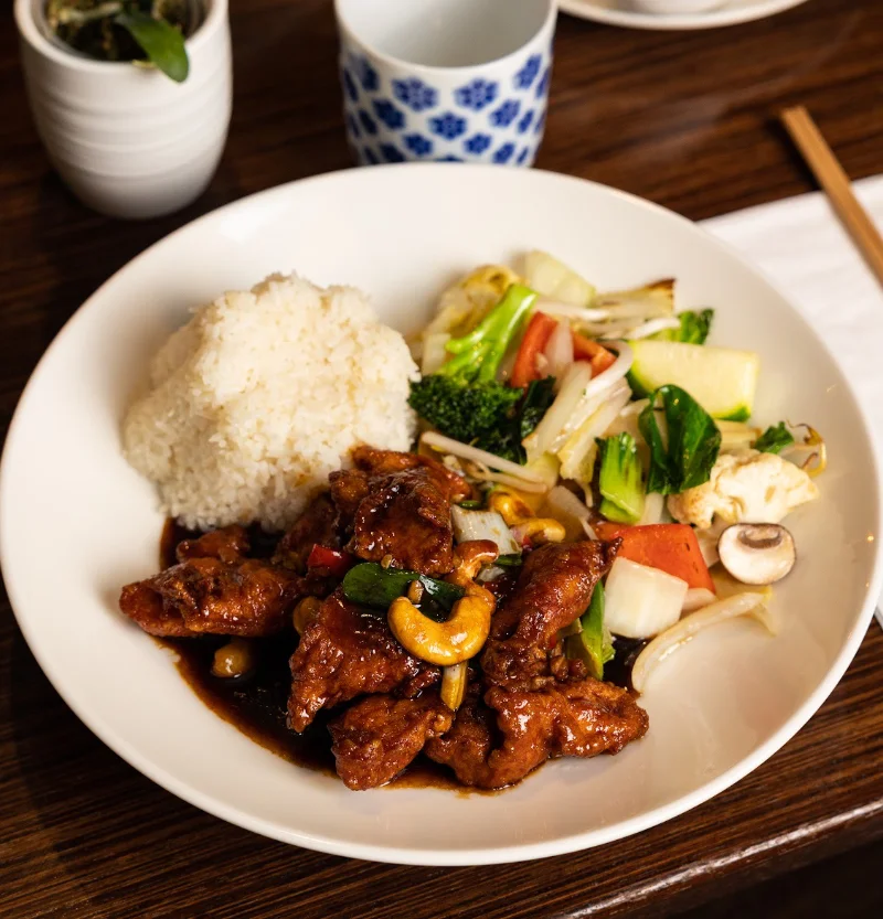 € 16,90Gebackene Hühnerfiletstücke mit Chili und Cashewnüssen, Wok Gemüse in Sojasauce, Beilage Reis + € 1,80